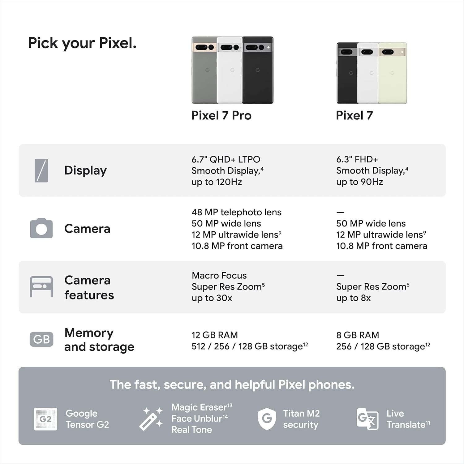 - Google Pixel 7 Pro is Google’s best-of-everything phone; powered by Google Tensor G2, it’s faster, more efficient, and more secure, with the best photo and video quality yet on Pixel[1].Other camera description:Front,Rear
