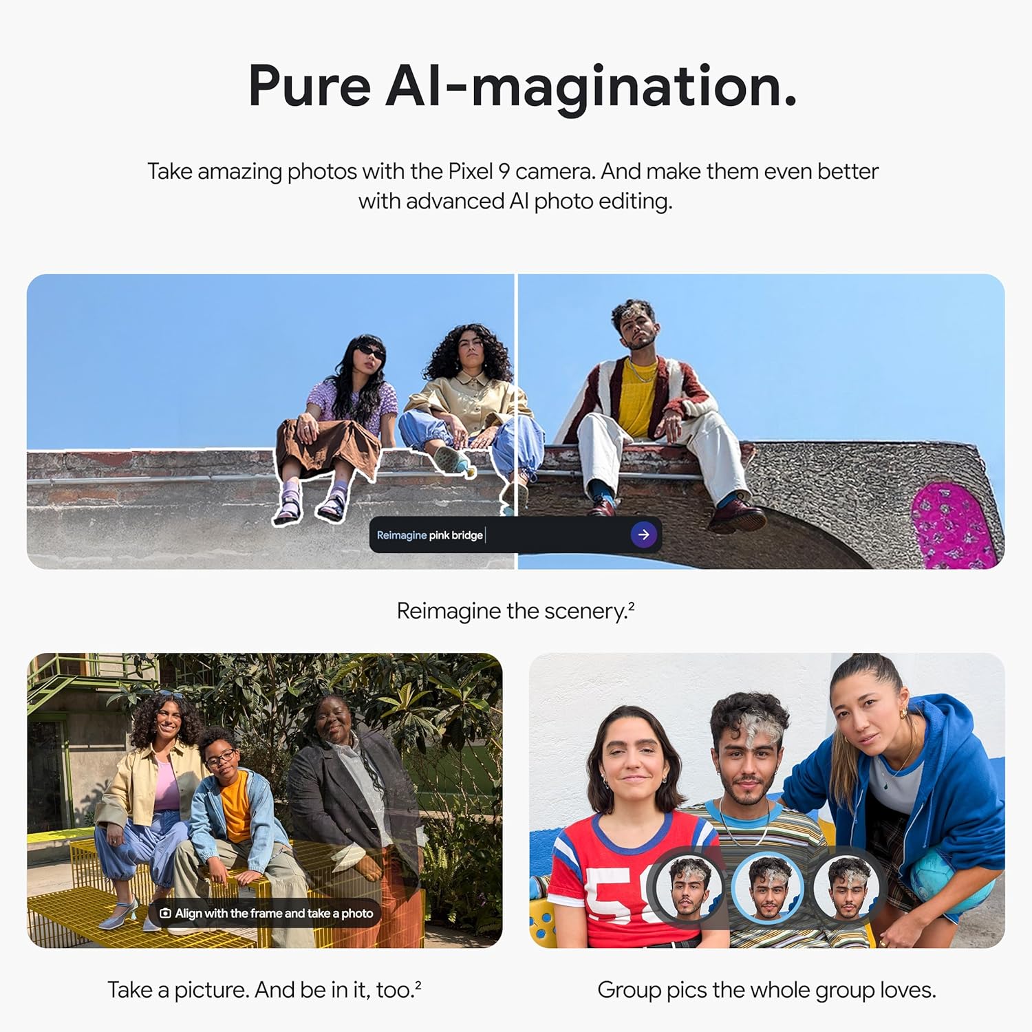- Make your photos better than you can imagine with Google AI; take a picture and be in it too with Add Me[2]; Best Take helps everyone look their best; and with Magic Editor, you can reframe photos, reimagine the scenery, and more[2]
