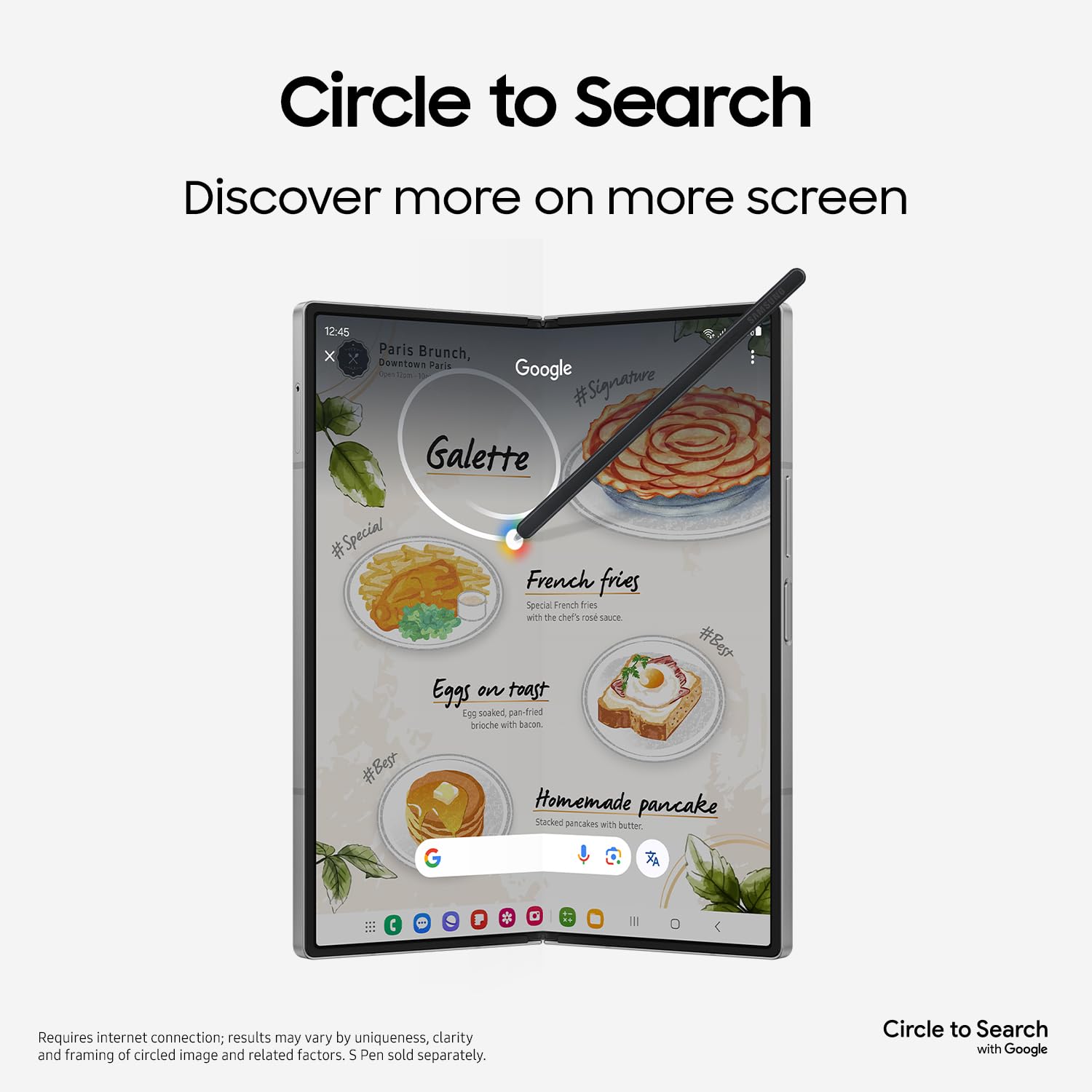 - CIRCLE IT. FIND IT. SEE IT: Make huge discoveries when you use Circle to Search¹ with Google on the large screen of Galaxy Z Fold6; Circle those shoes on your feed and easily see where to buy them; Search is easier than ever on an expansive screen