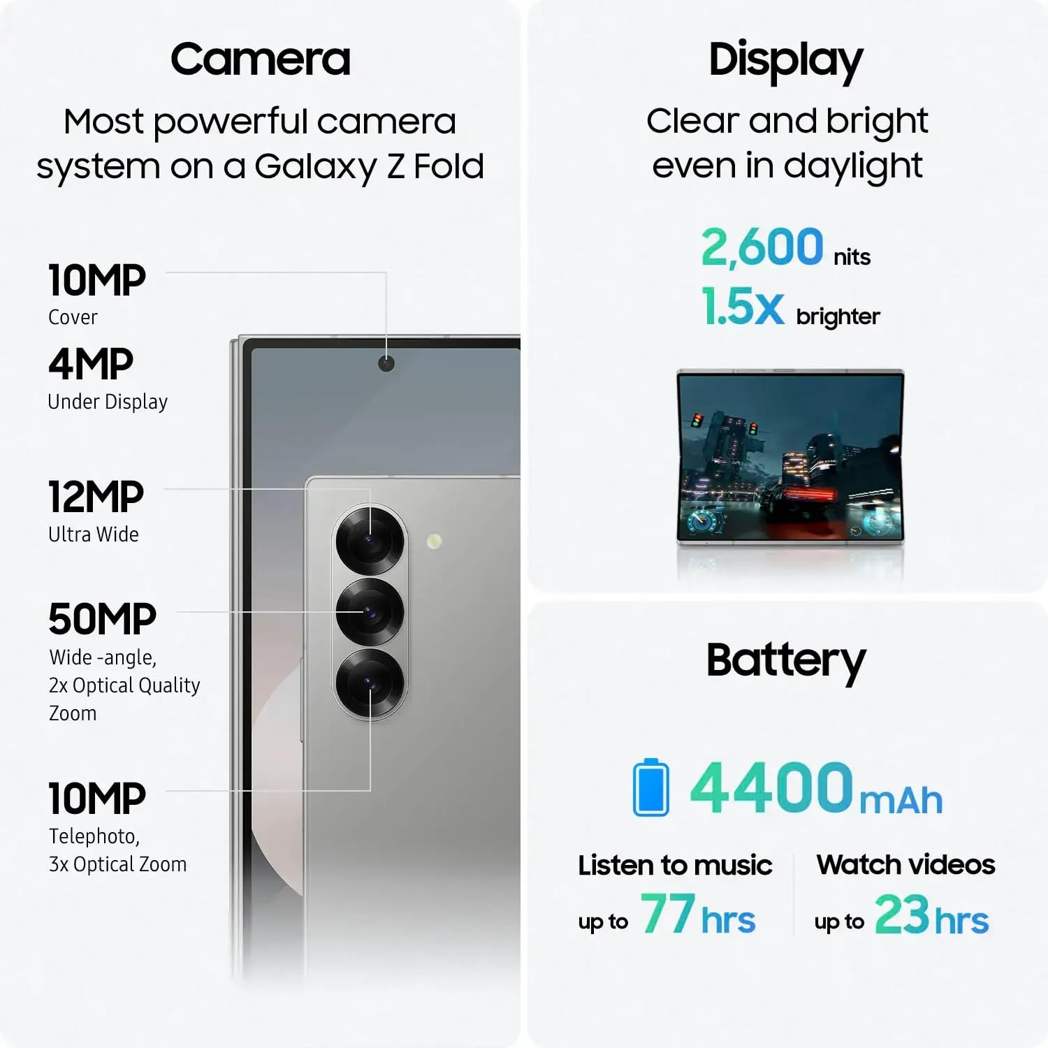 - 7.6″, Foldable Dynamic LTPO AMOLED 2X, 120Hz, HDR10+, 1856x2160px, Cover: 6.3″ Dynamic LTPO AMOLED 2X, 120Hz, Corning Gorilla Glass Victus 2, 968x2376px, 4400mAh Battery